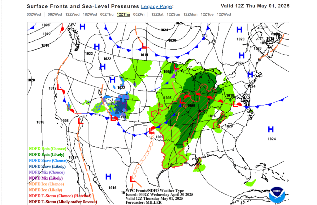 This will influence daily chances for scattered rain showers and isolated thunderstorms throughout today, Thursday, Friday, and into Saturday. Though the cumulative rainfall each day may trend near 0.10-0.30″, with locally higher amounts in thunderstorms, these totals will impact the upkeep of the track.